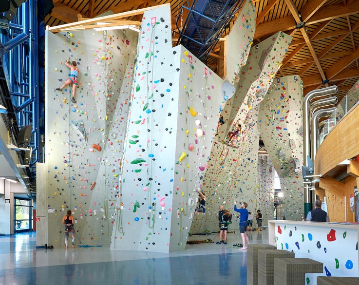 The 690 m² climbing wall offers over a hundred climbing routes for advanced and beginner climbers, a 70 m² bouldering area, a slackline, and training modules (campusboard pegboard, beams…).