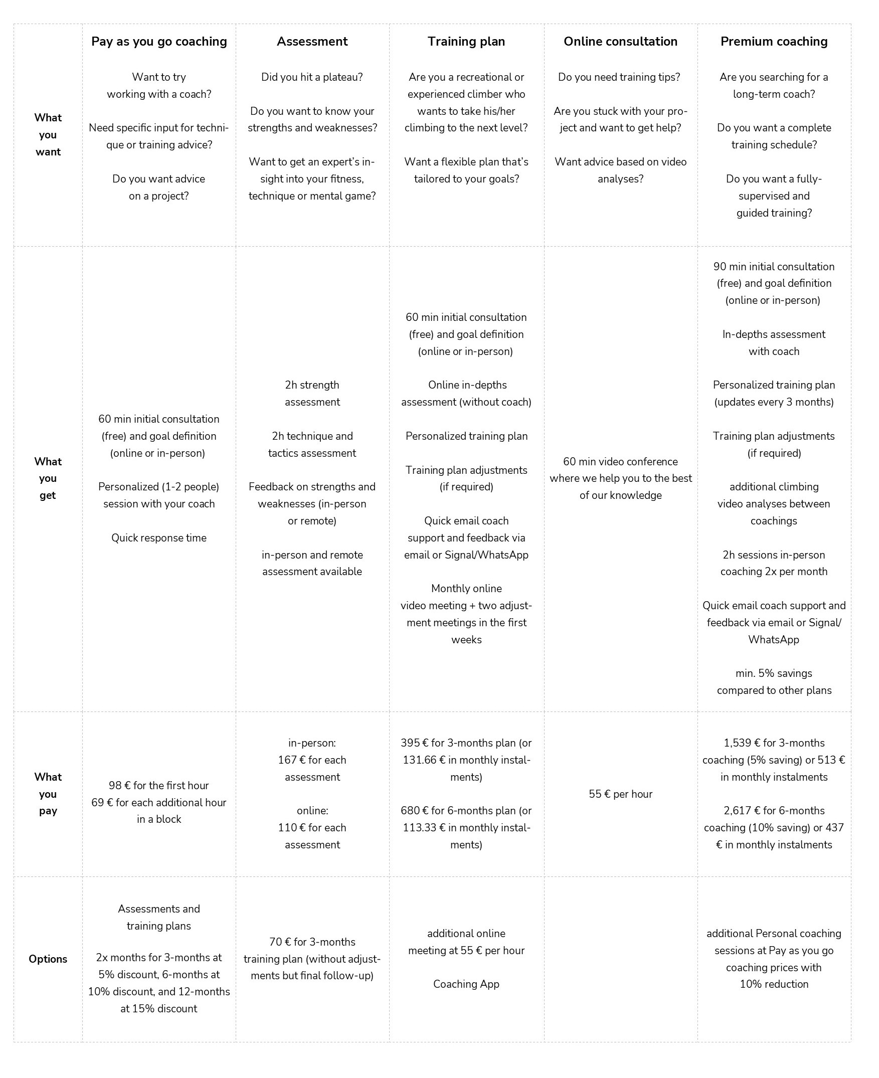 Additional Options: Add-on in-person coaching sessions available, Climbing Coaching App,