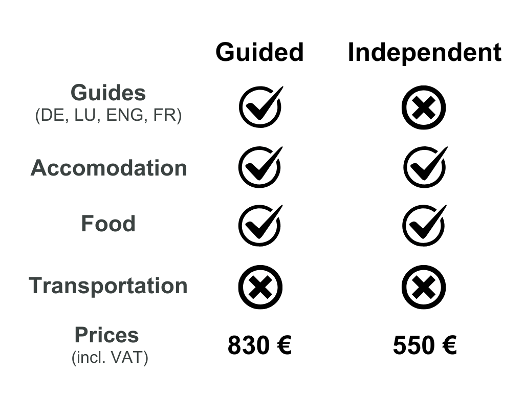 We offer two different prices depending on whether you are independent participant or one that needs guiding. An independent participant will benefit from the accomodation, food, local travel, but will receive only minor guiding instructions. This means that we will suggest climbing areas or routes, help with the local travel, but we will not supervise your climbing.